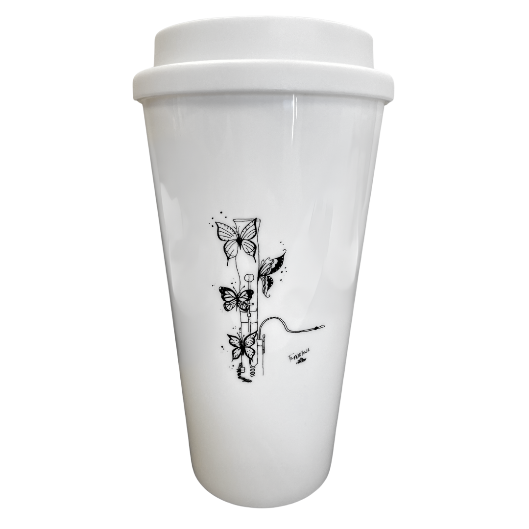 An every day standard travel coffee mug with a charming bassoon-butterfly design.