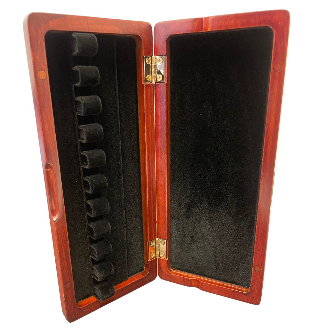 A sturdy reed case that holds 10 reeds and has a beautiful wooden finish.